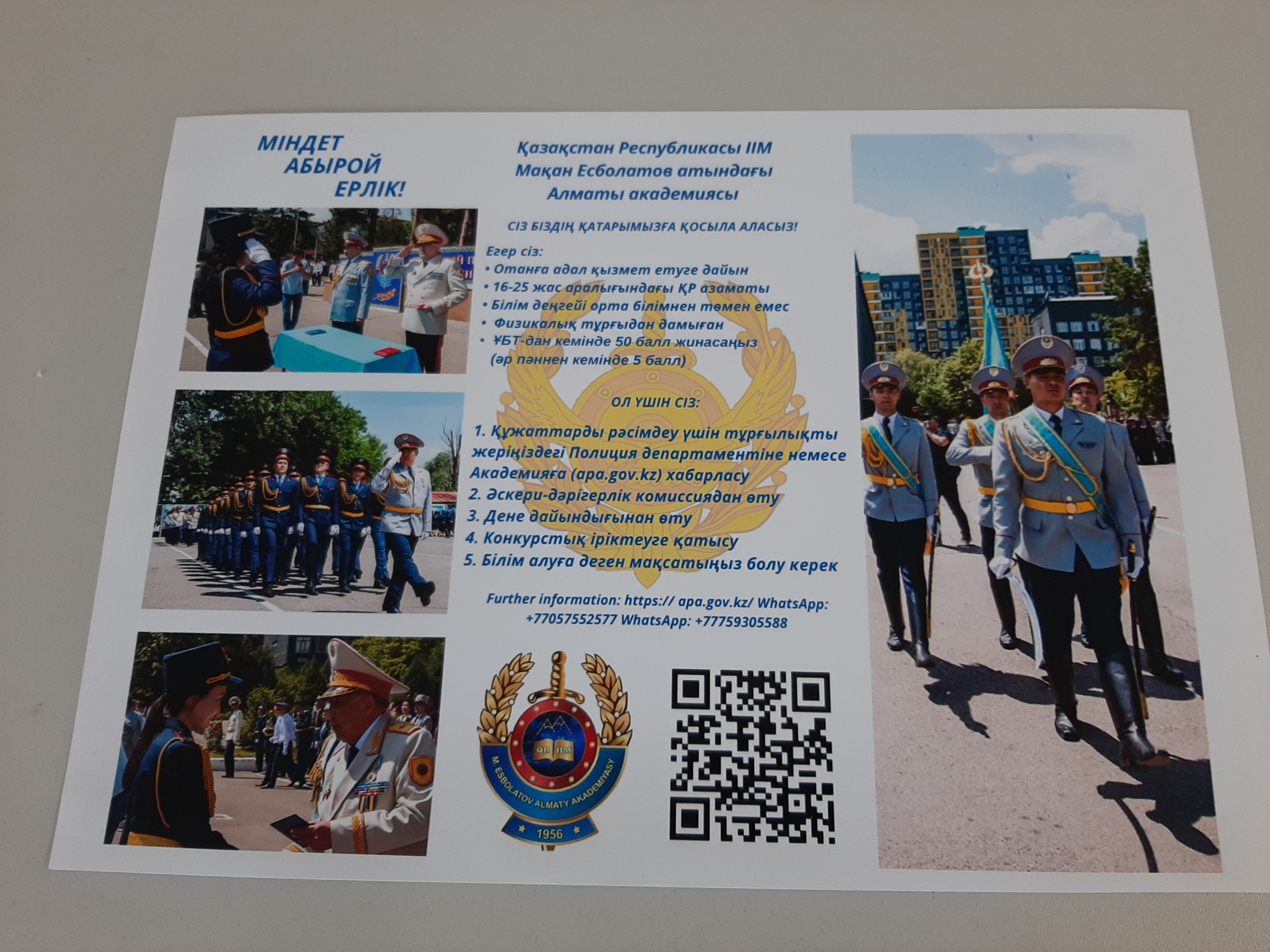 ҚР Ішкі істер министрлігінің жоғары оқу орнына оқуға түсуге конкурсқа қатысу үшін талапкерлер Ұлттық біріңғай тестілеуден немесе кешенді тестілеуден кем дегенде 50 балл, оның ішінде әрбір бейіндік пәннен кем дегенде 5 балл жинау керек.